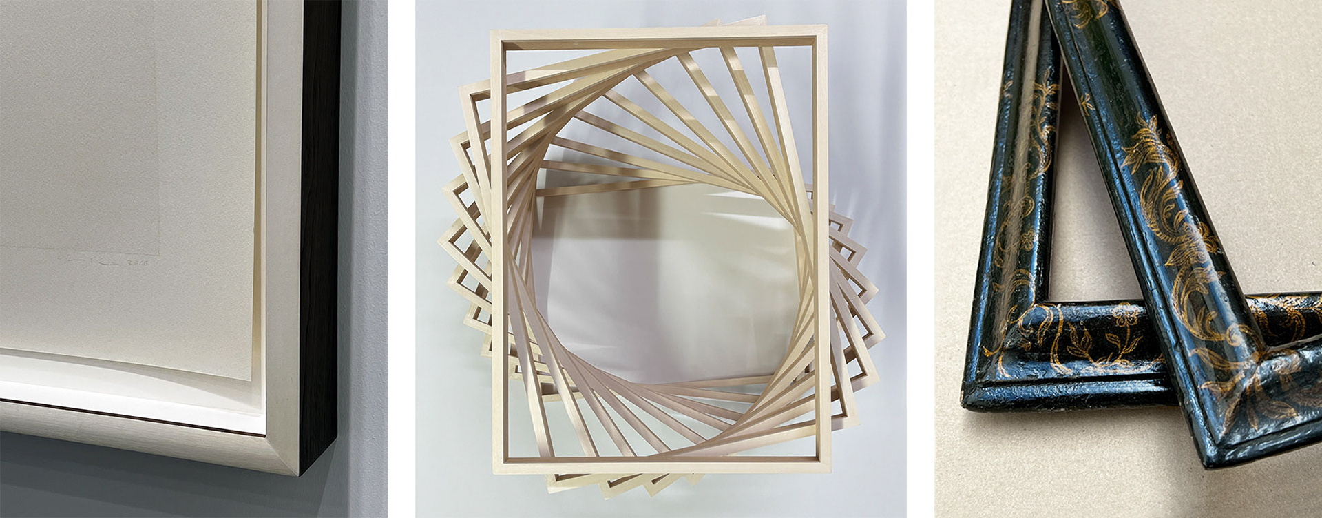 - über Eck verarbeitete Vergolderrahmen in verschiedenen Profilen und Oberflächen